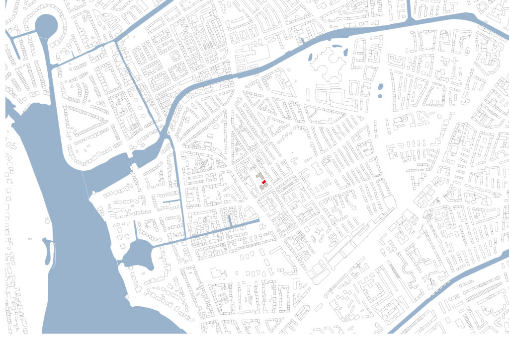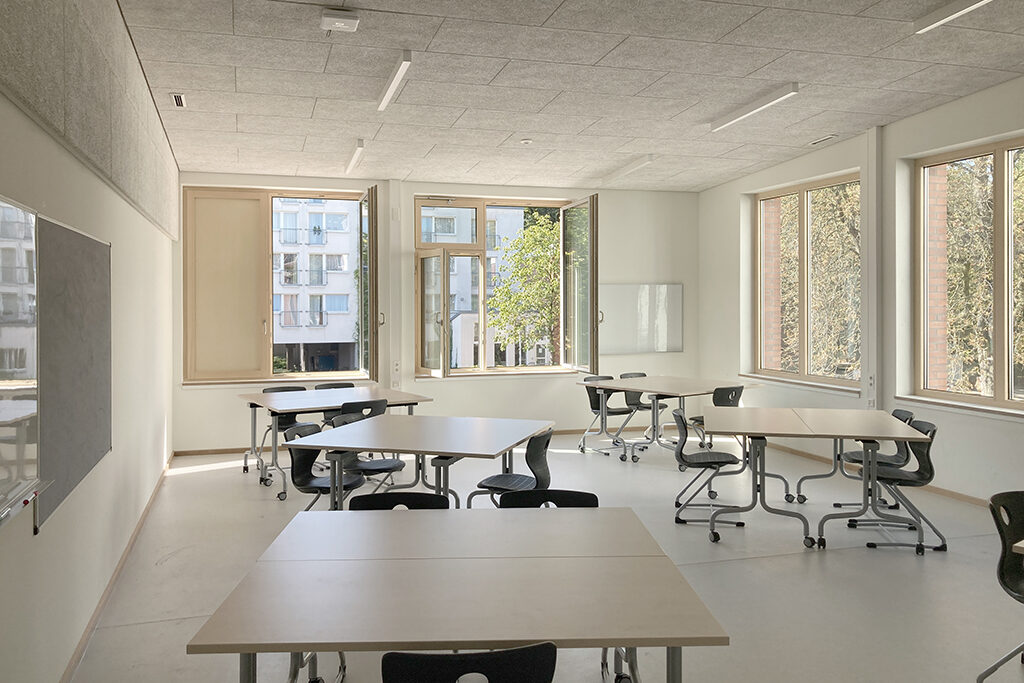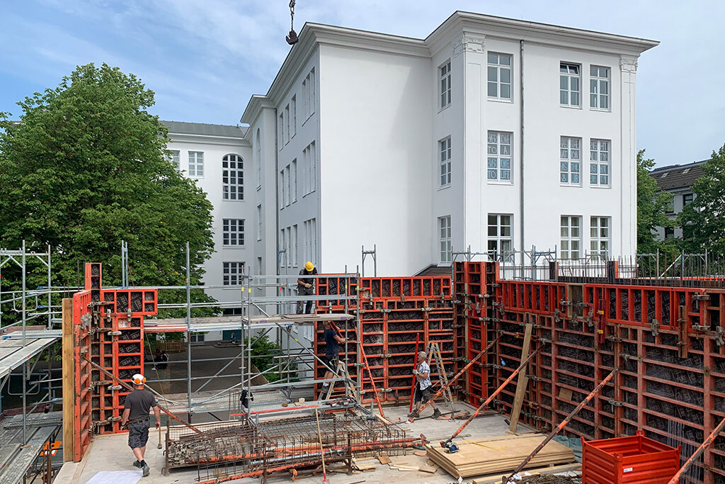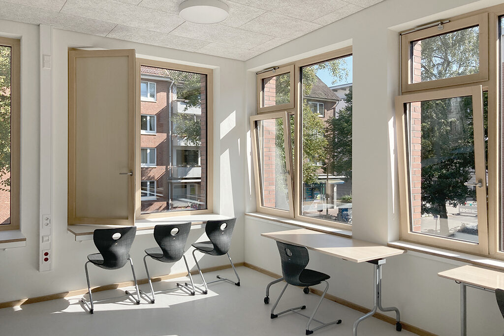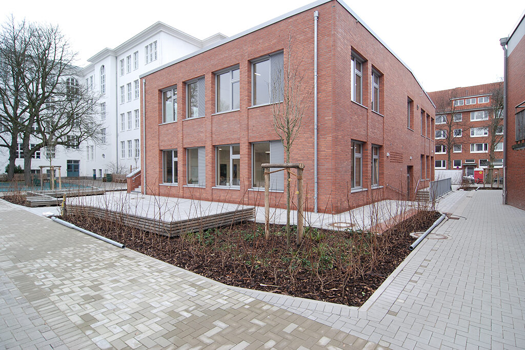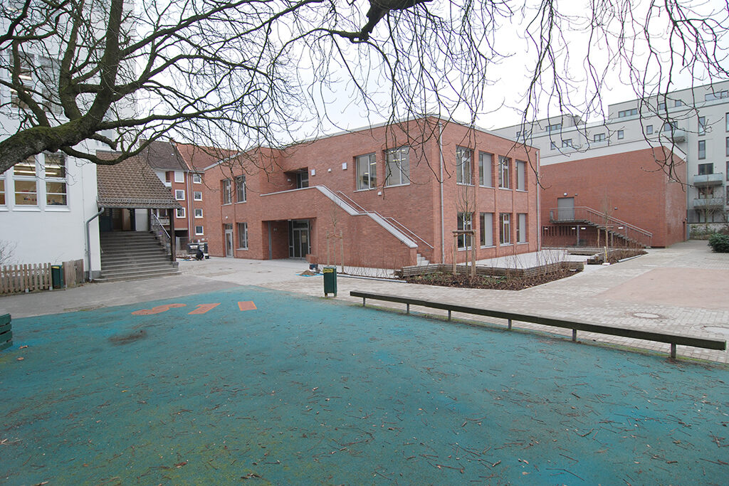 Die umliegenden Gebäude sind nahezu durchgängig in geschlossener Bauweise als Blockrandbebauung ausgeführt und weisen in der Regel 4-5 Geschosse auf. Dabei wechseln sich Gebäude aus der Gründerzeit mit Nachkriegsbauten und modernen Neubauten ab. Das Straßenbild prägende Materialien sind heller Putz und roter Verblendstein. Der Altbau fügt sich, obwohl er seitlich freistehend als Solitär geplant ist, in den Blockrand ein und markiert die Grenze des Schulgeländes zur Straße. Rein städtebaulich fällt eine Lücke im Blockrand zwischen dem Altbau und der im Süden angrenzenden Wohnbebauung auf. Die Lücke markiert das Schulgelände mit Zugang zum Schulhof. Städtebaulich dem Altbau untergeordnet und aus der Straßenflucht zurückversetzt wurde die Pausenhalle mit Aula in den 50er/60er Jahren in der Lücke des Blockrands platziert. Der als Solitär geplante Altbau behält seitlichen Freiraum, nicht zuletzt auch wegen der Fenster in der seitlichen Fassade. Die Position, Anordnung und Gestaltung des nun neu geplanten Gebäudes ist gemeinsam nach intensiver Vorabstimmung mit den beteiligten Behörden Stadtplanung, Denkmalschutzamt sowie Stadtgrün entwickelt worden.