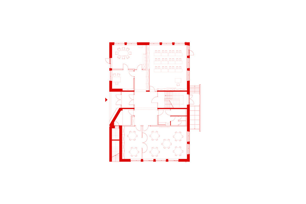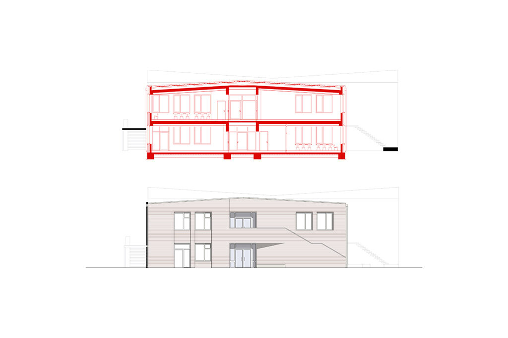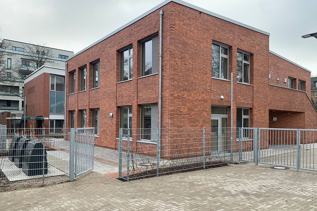 Der Schulstandort der Stadtteilschule in der Humboldtraße wurde um einen Neubau für eine 2-zügige Oberstufe der Jahrgänge 11-13 ergänzt. Das neue „Oberstufenhaus“ fügt sich straßenseitig zwischen Pausenhalle/ Aula und Altbau in die Lücke des Blockrands ein. Als Zugang zum Schulhof verbleibt ein klar definierter Durchgang mit ausreichendem Abstand zum Altbau. Das Oberstufenhaus wird in einer Flucht mit der Pausenhalle/ Aula leicht zurückversetzt auf dem Grundstück positioniert. Zum einen soll der Zugang zur Pausenhalle/ Aula sichtbar und begehbar bleiben und zum anderen dem deutlich höheren Altbau vorrangig die markante Straßenflucht gewähren. Die beiden zweigeschossigen Gebäude bilden städtebaulich und architektonisch ein Paar, so dass eine zu starke Heterogenität am Standort vermieden und die Stellung des Altbaus weiter gestärkt wird. Der neue Haupteingang des zweigeschossigen Oberstufenhauses erfolgt von der nordwestlichen Seite schräg gegenüber vom rückwärtigen Zugang des Altbaus. Das gesamte Erdgeschoss mit Verwaltungsräumen, einem Unterrichtsraum und einer Lernzone kann ebenerdig und damit barrierefrei erreicht werden. Als Referenz für die Fassadengestaltung des Oberstufenhauses dient die unmittelbar benachbarte Pausenhalle/Aula mit den großen vertikalen Fensterelementen, die gestalterisch durch vertikale Betonlisenen betont werden. Durch die Übernahme und Weiterentwicklung dieses Fenstermotivs auf die Fassaden des Neubaus mit zeitgemäßen Holz-Alufenstern und die Verwendung eines roten Verblendsteins als Fassadenmaterial entsteht untergeordnet neben dem starken Altbau ein Gebäudeensemble. Durch den Wegfall der vorhandenen Linde ergibt sich für das neue Gebäude ein rechteckiger, schlichter und wirtschaftlicher Grundriss. Die Außentreppe- gleichzeitig Eingang und 2. Rettungsweg des OG wird zum Gestaltungselement als erlebbarer Außenraum und orientiert sich in Ihrer Ausrichtung ebenfalls am Altbau. Die Grundrissgestaltung folgt dem Gedanken einer modernen, pädagogischen Ausrichtung, die offene Lernzonen in Kombination mit klassischen Unterrichts- und Differenzierungsräumen vorsieht. Verwaltungs- und Nebenräume sind zentral am Foyer im Erdgeschoss geplant. Darüber hinaus nimmt das Erdgeschoss einen Unterrichtsraum und eine offene Lernzone, das Obergeschoss zwei Unterrichtsräume und eine große Lernzone für zwei Kurse auf. Generell sorgen offene Sichtbezüge und großzügige Fensterfronten auf beiden Etagen für eine gute natürliche Belichtung und eine angenehme Arbeits- und Lernatmosphäre. Unterschiedliche Möblierungsvarianten bedienen die Anforderungen einer Oberstufe für Frontalunterricht, Groß- und Kleingruppen oder auch Einzelunterricht. Gleichzeitig bieten sich Rückzugsmöglichkeiten in lernfreien Zeiten. Das Gebäude wird in massiver, zweischaliger Bauweise ohne Keller erstellt und wurde mit Leichtbeton-Fertigteildecken geplant.