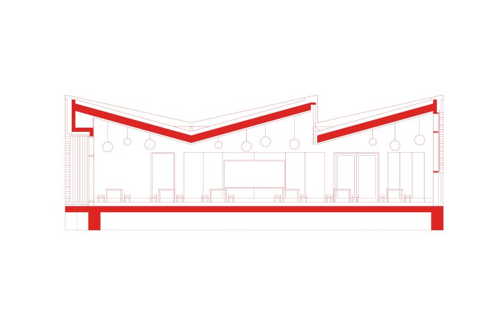 Der Haupteingang zur Mensa befindet sich in Verlängerung der Haupterschließungsachse Pausenhalle/ Verwaltung/ Campus und orientiert sich gleichzeitig zum Eingang des Unterrichtshauses Kreuzbau. Als überdachter Außenbereich bietet der Eingang geschützten Raum für wartende Eltern und Besucher. Ein weiterer überdachter Außenraum entsteht frontal vor dem Saal. Hier haben Schüler während der Pausenzeiten einen Unterstand mit Aussicht auf den Schulhof. Die Garderobe befindet sich im Eingangsbereich zentral vor Saal, WC-Bereich und Koordinationsräumen. Der Koordinationsbereich liegt ruhig und mit optimaler Belichtung an der Nordostseite des Gebäudes. Von hieraus lässt sich der Labyrinthgarten einsehen. Der multifunktional nutzbare Saal ist nord-süd ausgerichtet, zum Schulhof und zur Hallerstraße. Zum Schulhof erhält das Gebäude eine bodentiefe Pfosten-Riegel-Fassade mit zwei Ausgängen, die als zweiter Rettungsweg funktionieren. Zur Hallerstraße hat die Mensa eine 1,50 m hohe Brüstung die Einblicke auf essende Kinder unterbindet. Durchblicke zum Schulhof aber ermöglicht. Die markante Dachform mit Lichtband findet sich auch im Innenraum als raumprägendes Element wieder.