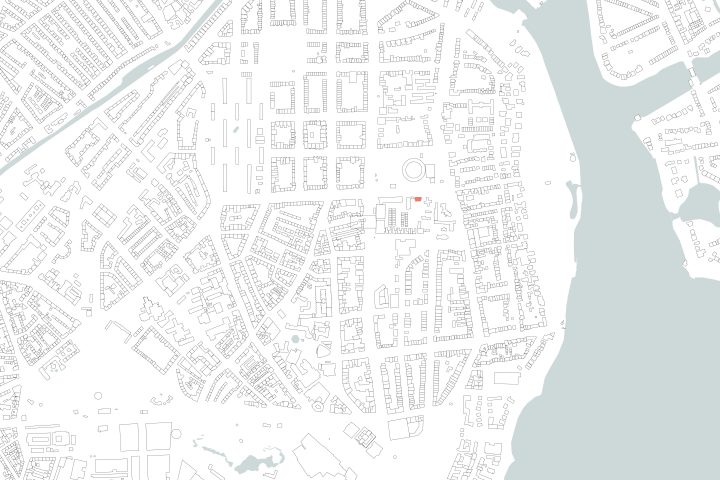 Die neue Mensa der Grundschule Turmweg steht als Teil eines Ensembles von Schulgebäuden frei auf dem weitläufigen grünen Campus, der sich mitten im innerstädtischen Kontext des Stadtteils Rotherbaum befindet. Der Neubau fügt sich als einer von mehreren roten Ziegel-Solitären in die Gruppe der bestehenden Schulbauten ein, wobei rot gefärbte Mörtelfugen der Ziegelfassade eine moderne homogene Erscheinung geben.